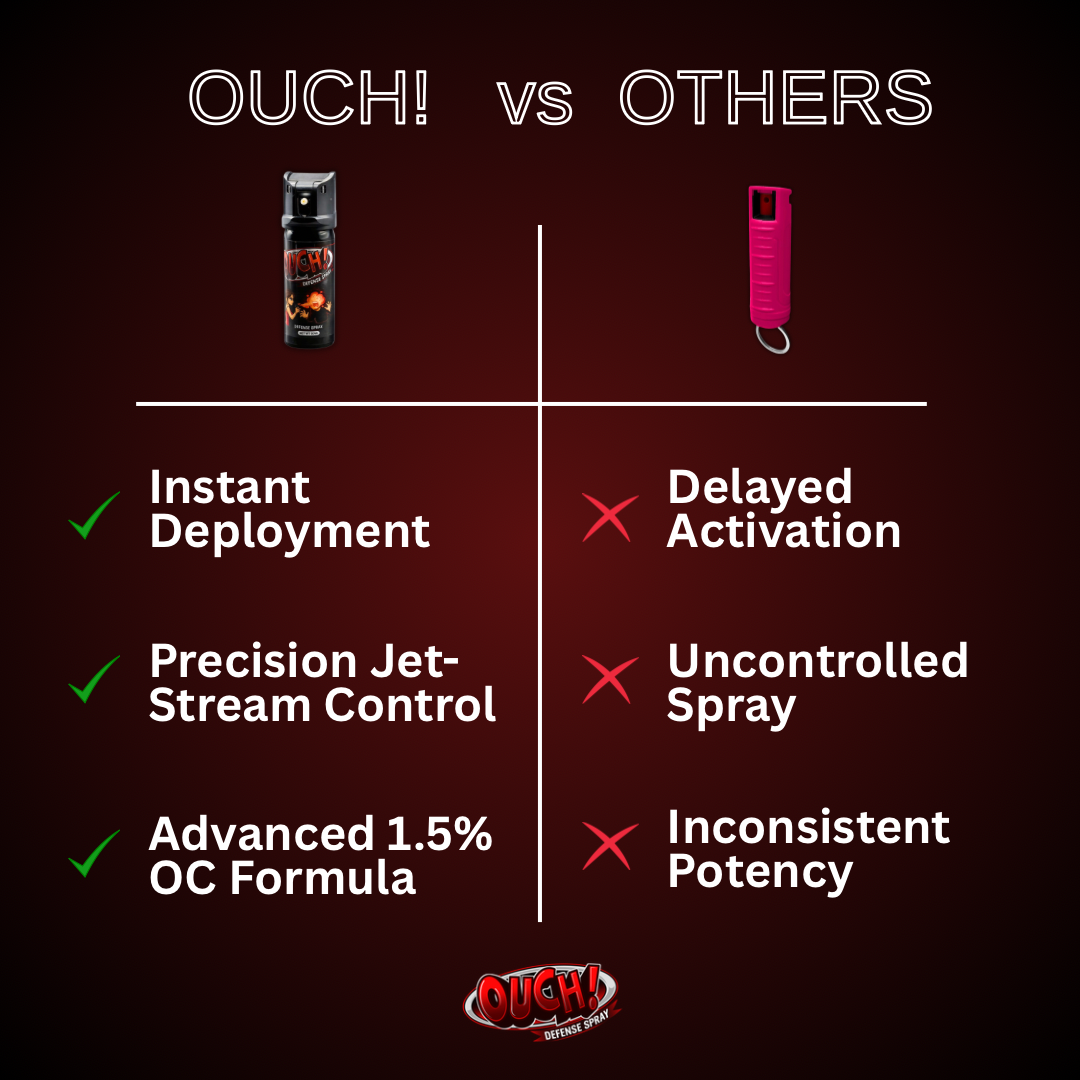 OUCH! Defense Spray is engineered for moments when hesitation isn’t an option. Unlike ordinary sprays that fail under pressure, OUCH! delivers instant deployment, precision jet-stream control, and consistent 1.5% OC potency. Giving you reliable protection and confidence when every second counts.